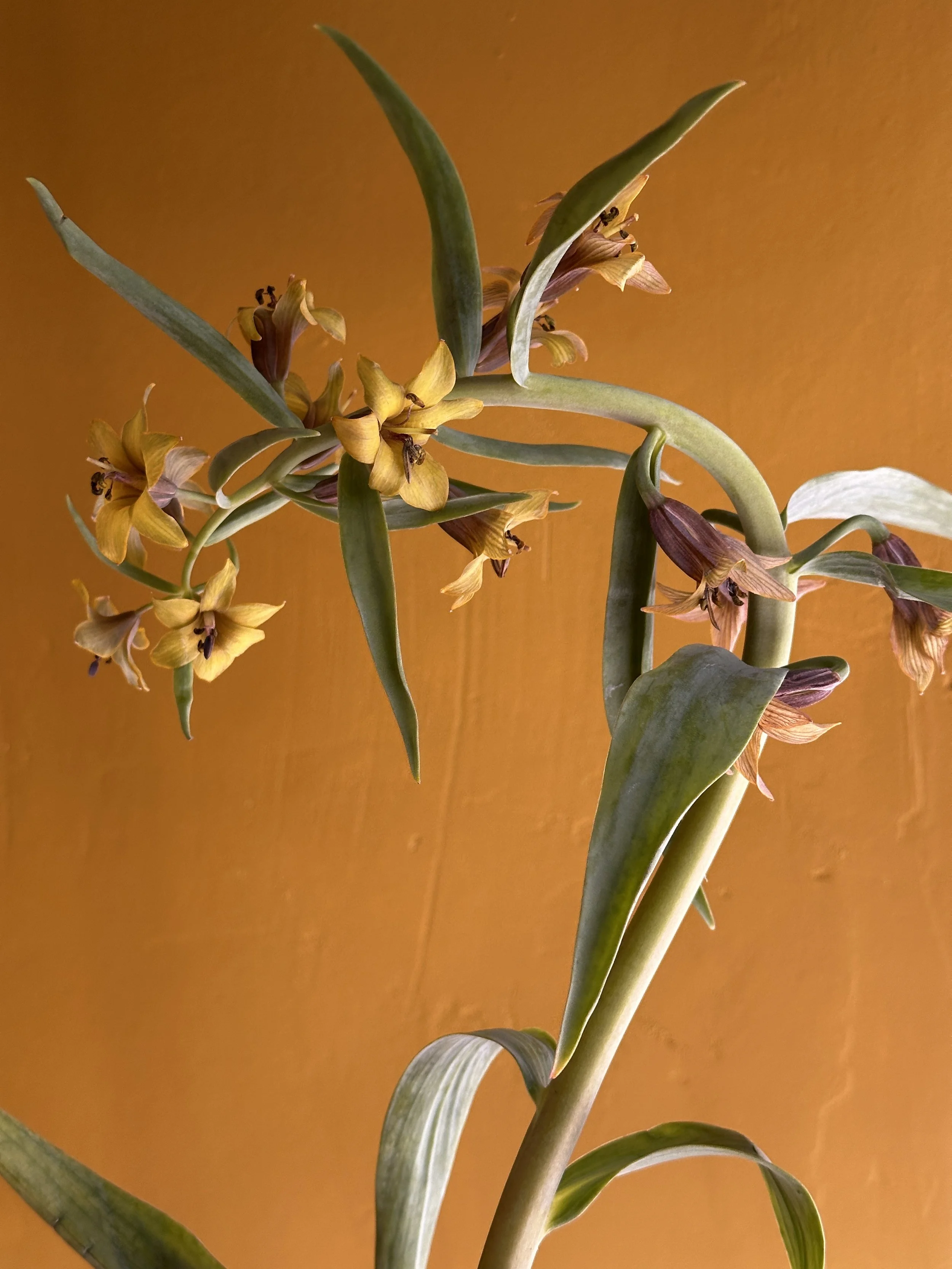 One of my very favorite spring flowers—and a big obsession of mine—is the Fritillaria. These incredibly varied flowers grow in both huge and tiny packages (we’re talking anywhere from 5" to 36" tall), with colors ranging from purple to orange, white/green, and even a few shades of yellow. Within the genus Fritillaria, there are over 100 reported species, and each one is so special. They follow a bulb lifestyle—planted in fall to emerge in spring—and with the right climate, they can continue to multiply.Last season, I was lucky enough to find and design with several different varieties, and one of my favorite parts of this experience was noticing the subtle differences between each species. Below are photos and small descriptions of each variety, along with a few finished designs. Most of these stems were imported from Holland, where they seem to be grown most prolifically for sale, but depending on your area, you may also find locally grown cuts in early spring.Here are some Fritillaria species with photos and a brief description: